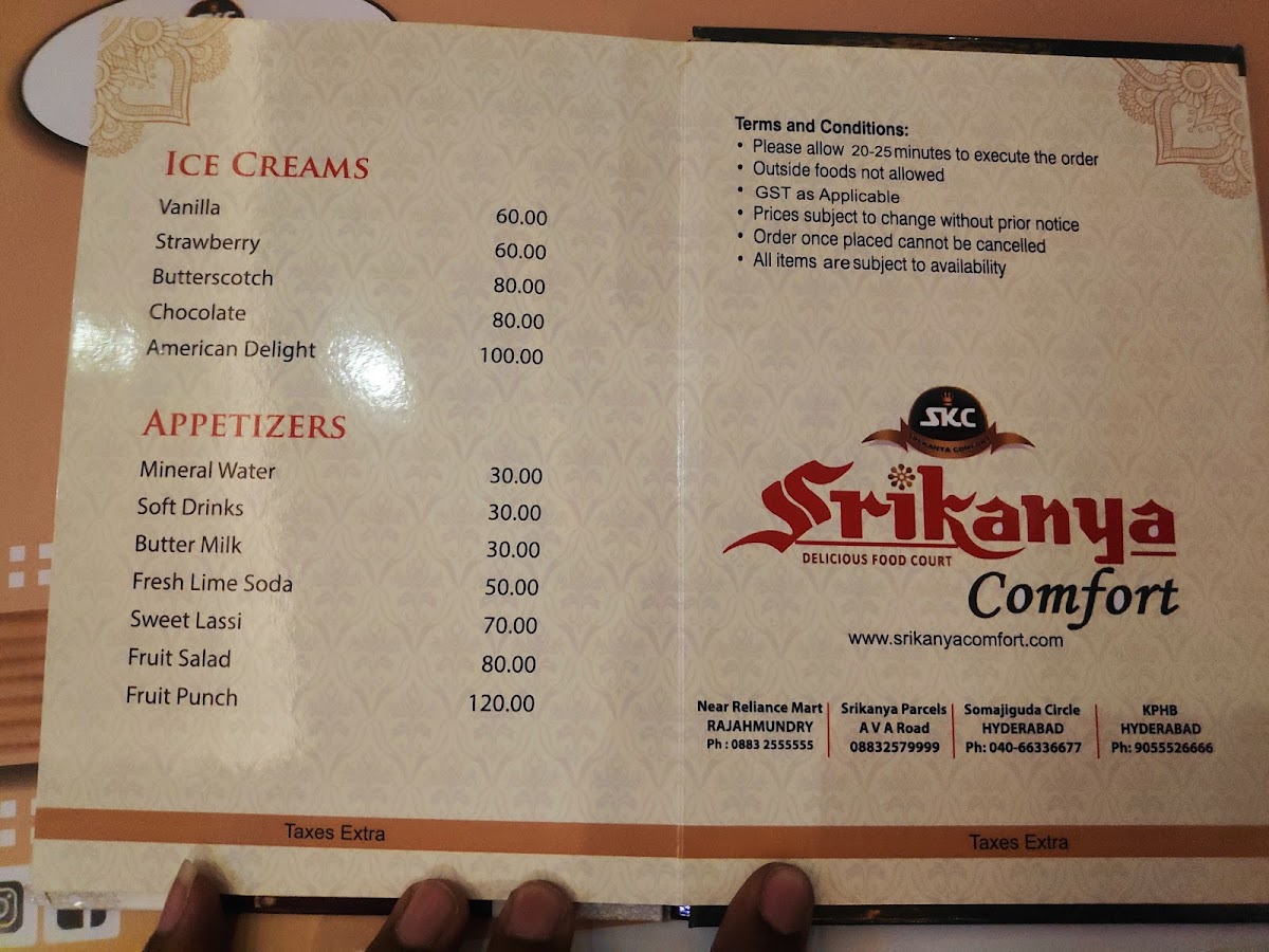 Welcome to Srikanya Comfort, a culinary gem located in Rajamahendravaram, Andhra Pradesh. This restaurant offers a diverse menu, specializing in both vegetarian and non-vegetarian dishes that cater to every palate. Start with their soups—from Veg Hot & Sour to Chicken Lemon & Coriander, there's something to warm everyone's heart.
